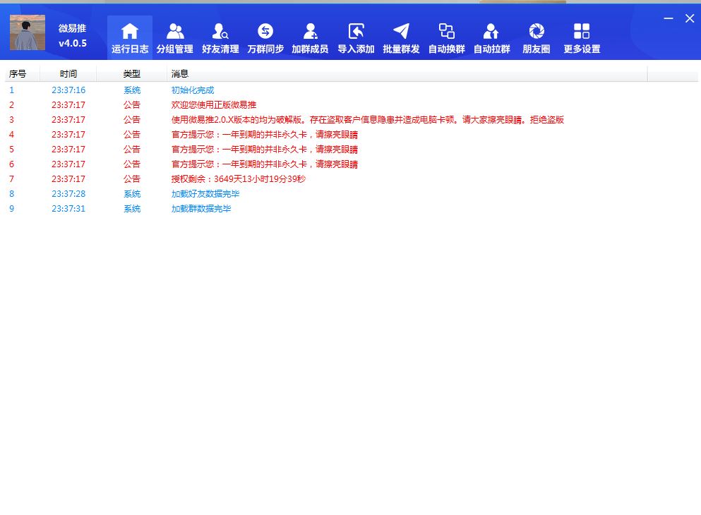 全新升级,运行更加流畅稳定。细节优化,功能更大强大实用。新增循环群发、自动跟圈、手机标签同步、批量加人等功能。