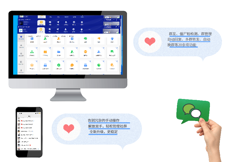 从消息群发、群管理、自动回复到好友检测、朋友圈、小程序等20余项功能,一站式解决您的社群运营难题